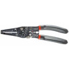 Pliers body made of flat steel, painted black, legs with plastic grips and opening spring. Crimps for 0.35 – 1; 1.5 – 6 insulated / uninsulated plugs / connectors and 7 – 8 mm car ignition terminals. Threaded cutter for bolts M2.6 − M5. Wire stripper 0.5 − 6 mm2. Cutting for soft Cu and Al wires. Long serrated clamping nose for working in confined spaces.